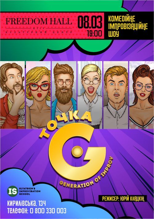 Популярне комедійне імпровізаційне шоу «Точка G – Generation of improv!» – це комедія, яка створюватиметься на ваших очах із ваших фантазій, де талановиті й харизматичні актори подарують заразливий сміх і яскраві емоції!